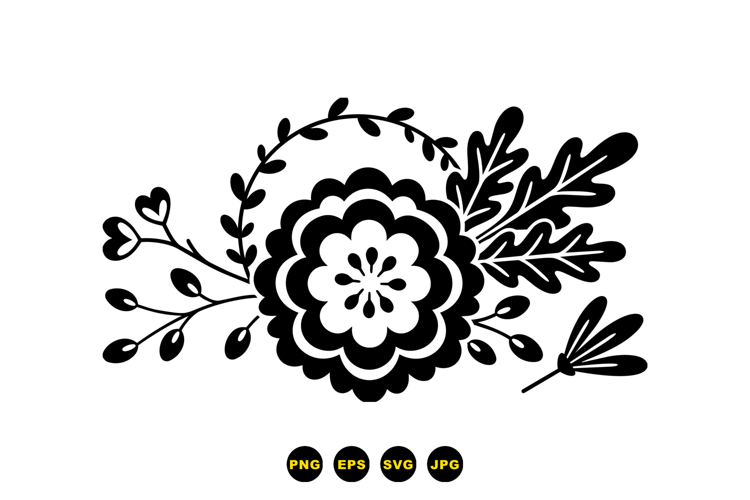 A folk art vector shows a layered black flower silhouette with stylized leaves and sprigs suitable for logos posters and textile patterns bold and ornamental