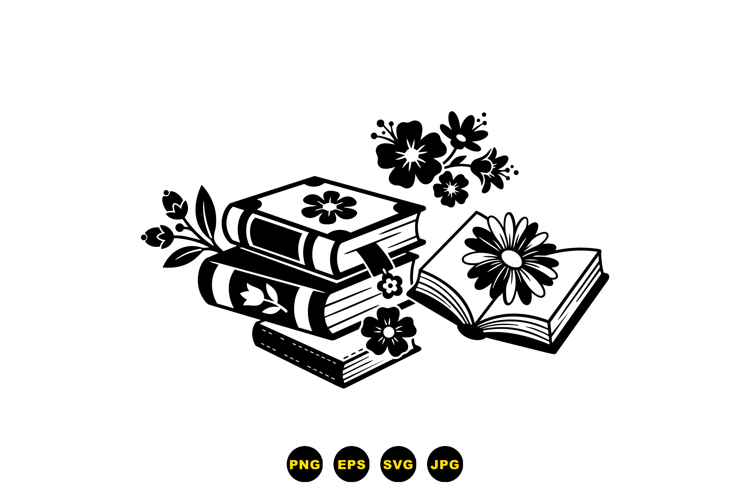 A tattoo flash style vector depicts stacked books and an open book adorned with daisies and blossoms suggesting vintage reading and botanical study serene