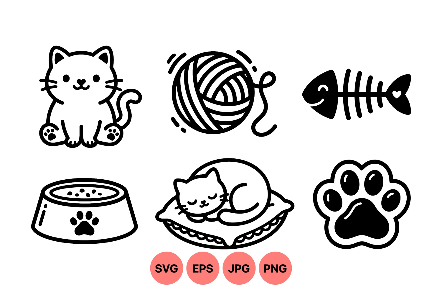 Paw Print Icon Black And White Cat Cat Line Art Yarn Ball Clipart Simple Cat Drawing Sleeping Cat Illustration Kitten Clipart Design Playful Cat Drawing Pet Toy Clipart Cat Bowl Graphic