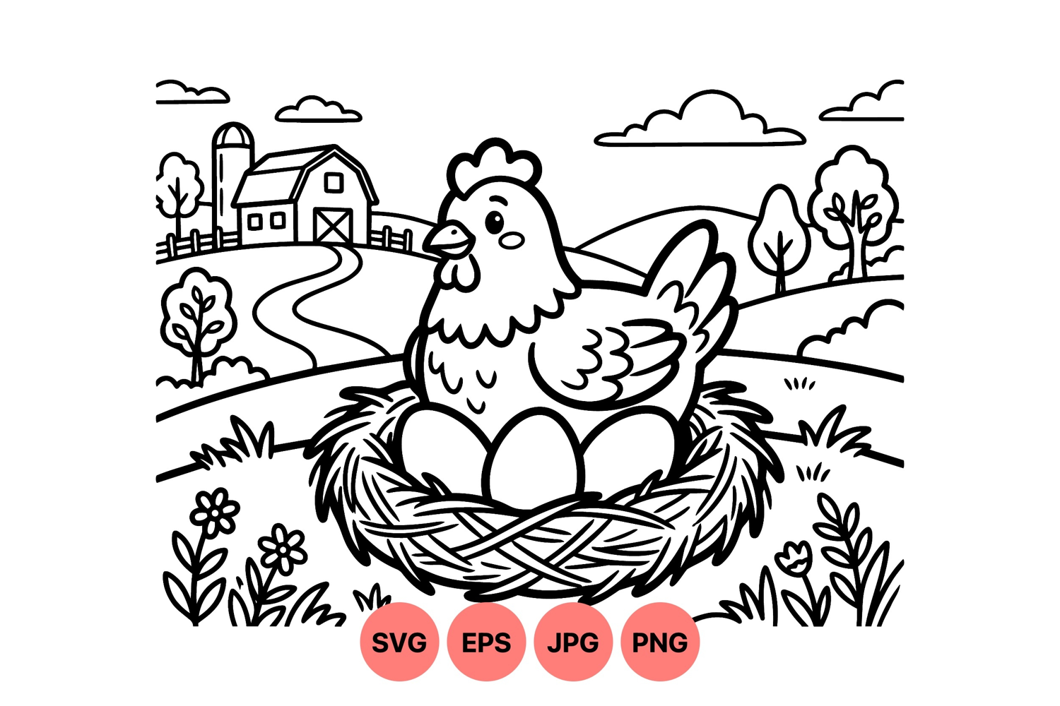 A farm chicken sits protectively on eggs in a detailed nest with a barn, rolling hills, trees, and flowers in the countryside. simple black and white vector line art style.