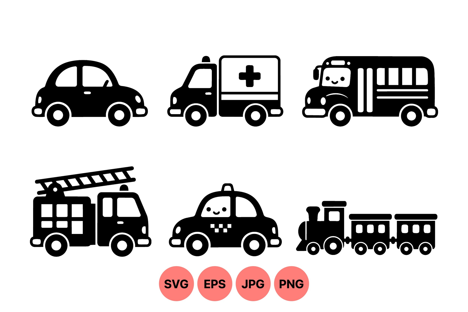 Flat black vector icons showing six cute smiling vehicles including taxi fire truck ambulance school bus and train on white background with friendly style