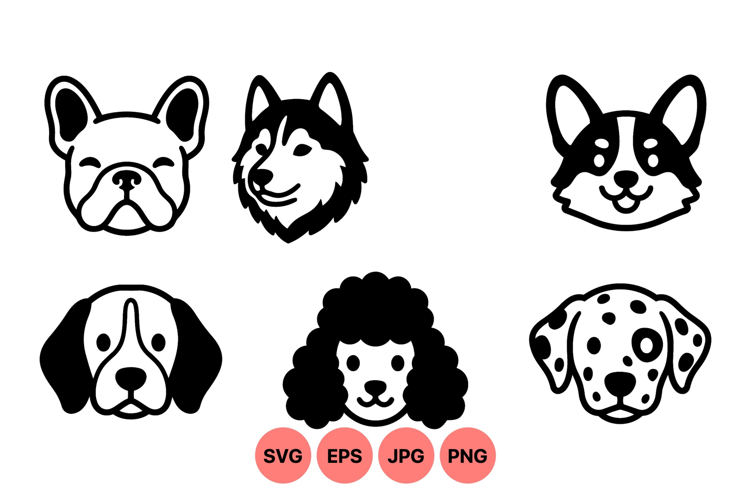 A clean vector of six distinct dog breed faces shown in black and white minimalist style featuring husky poodle dalmatian corgi beagle and french bulldog icons balanced in simple layout peaceful