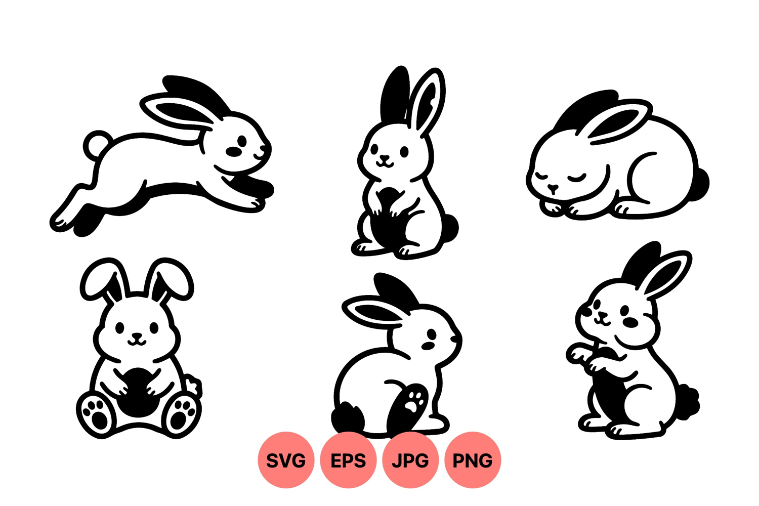 A charming vector of black and white bunnies in different poses including running sitting and sleeping suitable for children designs friendly vibrant