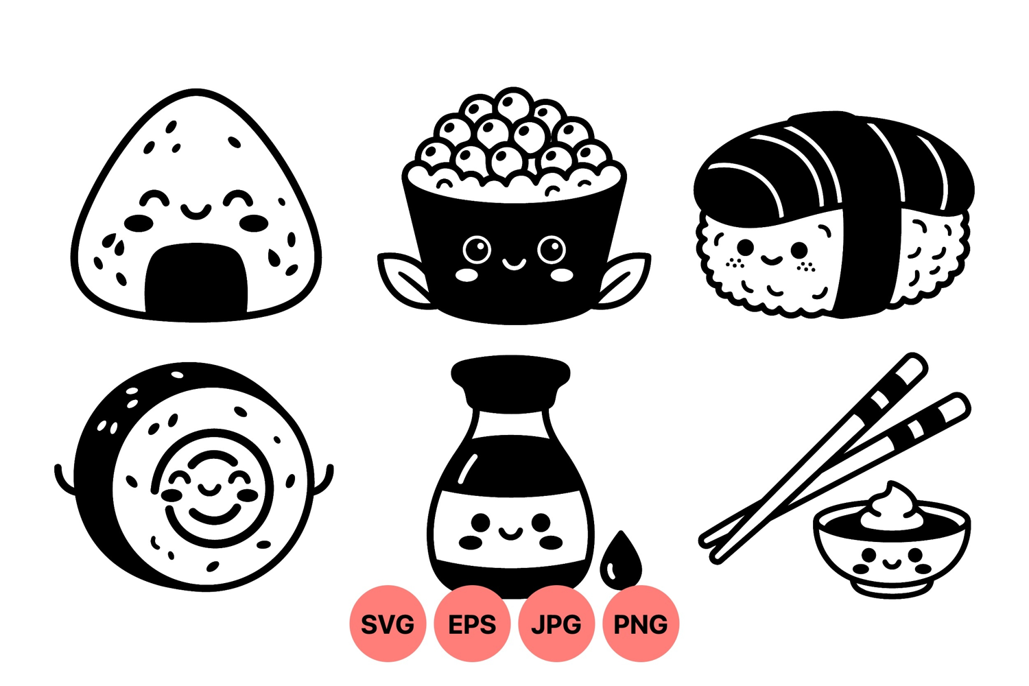 Cute kawaii style sushi food icons including onigiri rice ball roll soy sauce and chopsticks with smiling faces in simple black and white vector art playful and charming