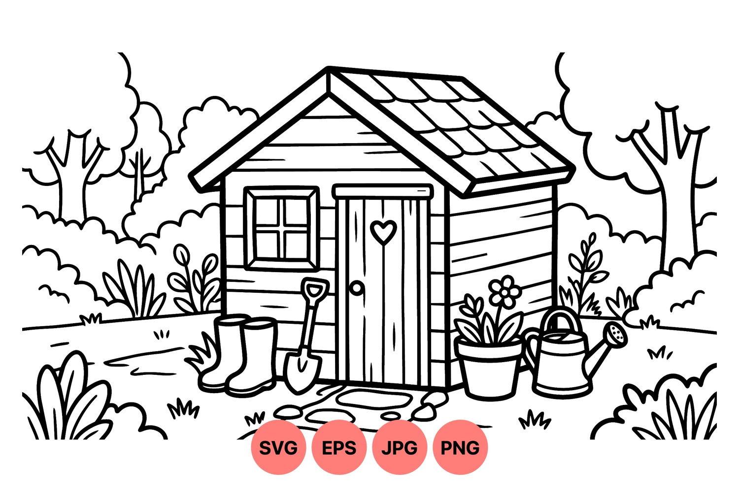 Garden Tool Clipart Spring Garden Illustration Black White Lineart Flower Pot Graphic Rustic Outdoor Design Hand Drawn Shed Cute Gardening Art Wooden Garden Door Outdoor Nature Graphic Country Garden Art