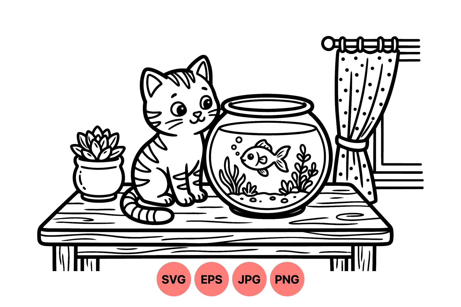 A charming line art vector showing a curious kitten sitting beside a round fishbowl with a goldfish inside on a wooden table near a window with polka dot curtain peaceful black and white artwork