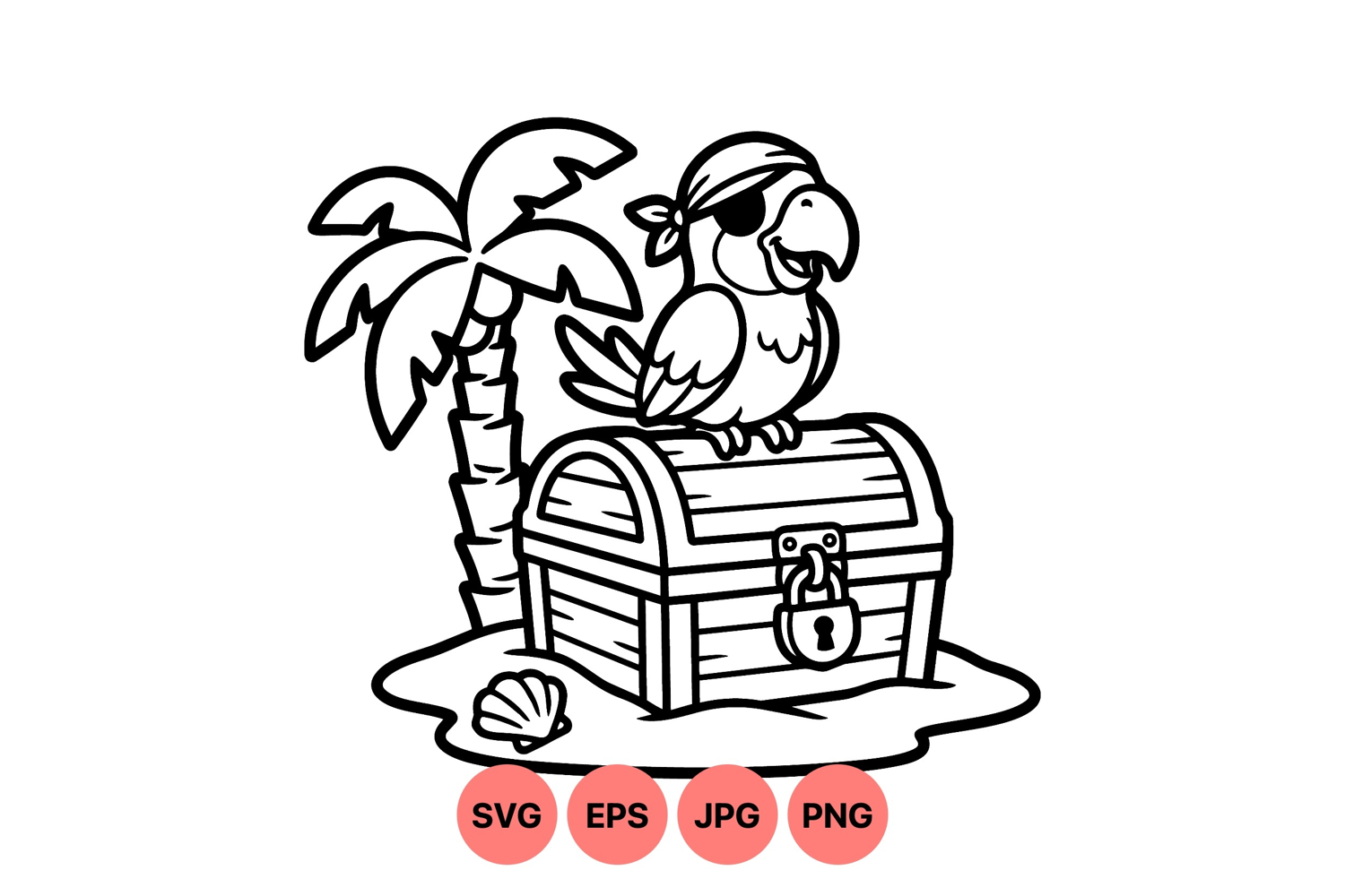 A cheerful pirate parrot wearing an eye patch perches on a locked treasure chest beside a palm tree and seashell on a small sandy island in a simple cartoon style.