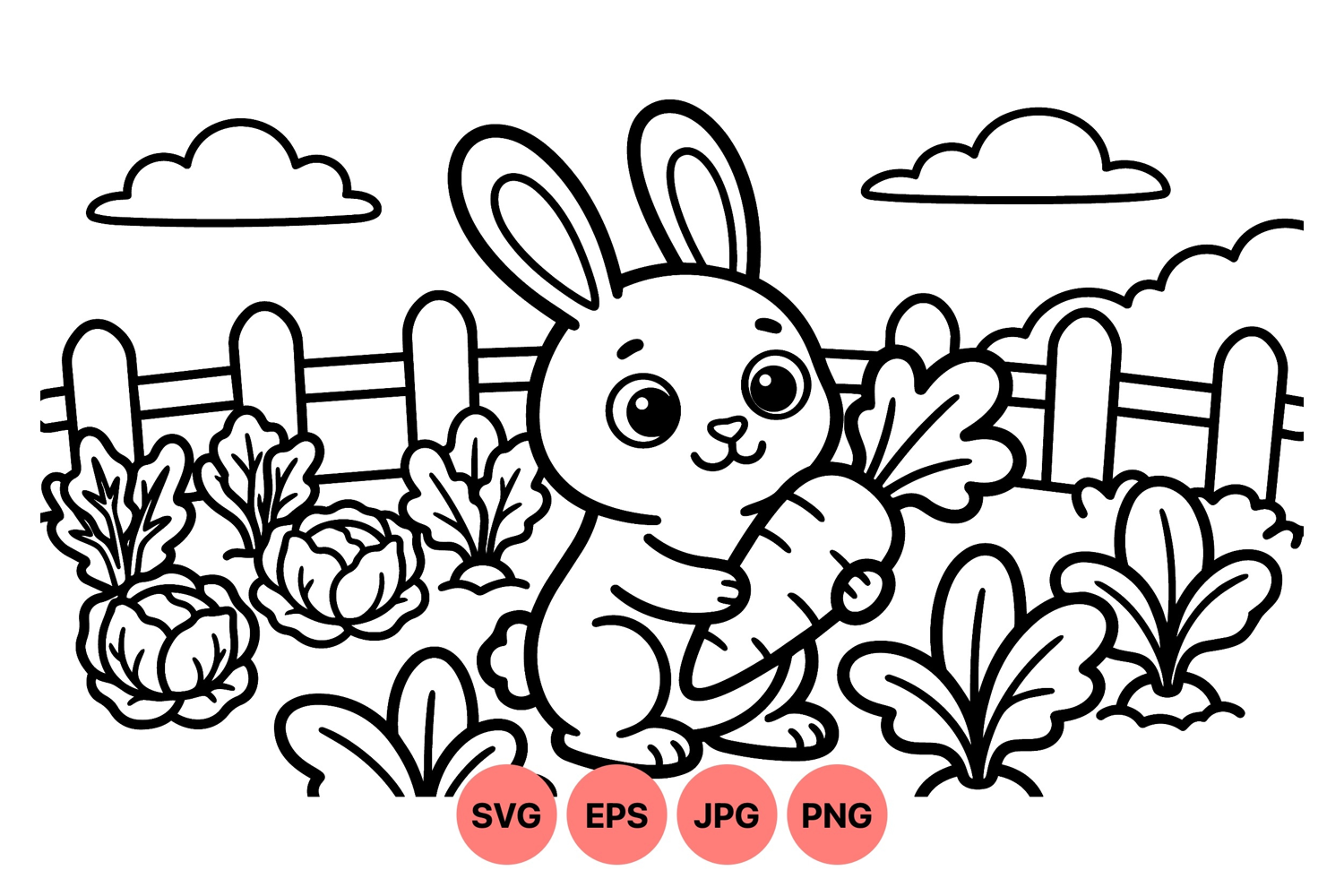 Adorable bunny clutching a carrot in a vegetable garden surrounded by cabbages and leafy plants under fluffy clouds in a simple black and white vector line art style.