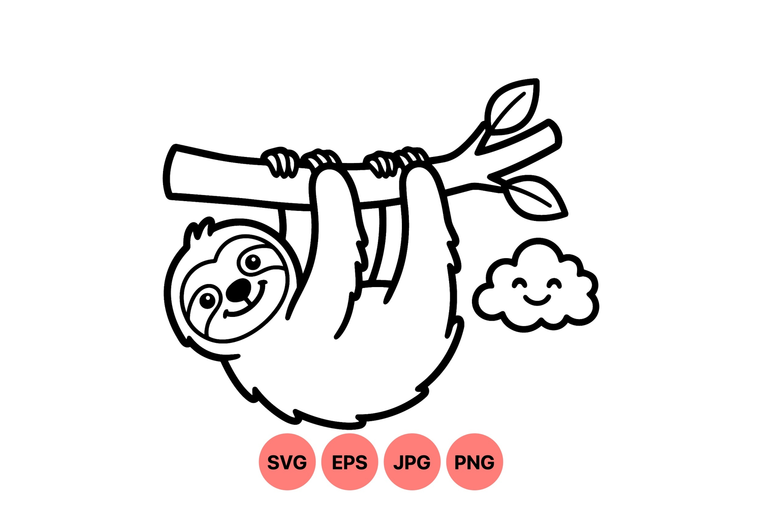 Cute Sloth Svg Kids Craft Svg Printable Svg Design Nature Theme Svg Animal Clipart Design Cartoon Animal Design Black White Outline Vector Sloth Illustration Hanging Sloth Graphic Happy Face Cloud