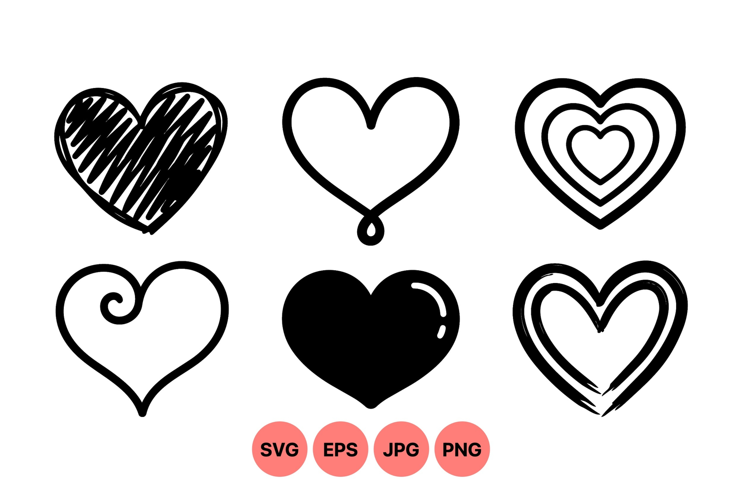 A of six different black and white heart vector icons featuring hand drawn scribble swirl bold glossy and double line styles for creative design and romantic themes