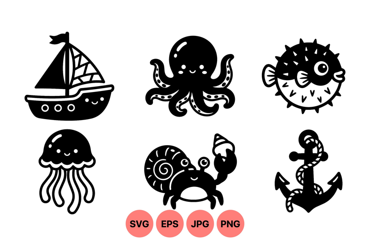 Adorable black and white cartoon style sea creatures including a sailboat octopus pufferfish jellyfish hermit crab and anchor showing happy expressions in a vector layout playful