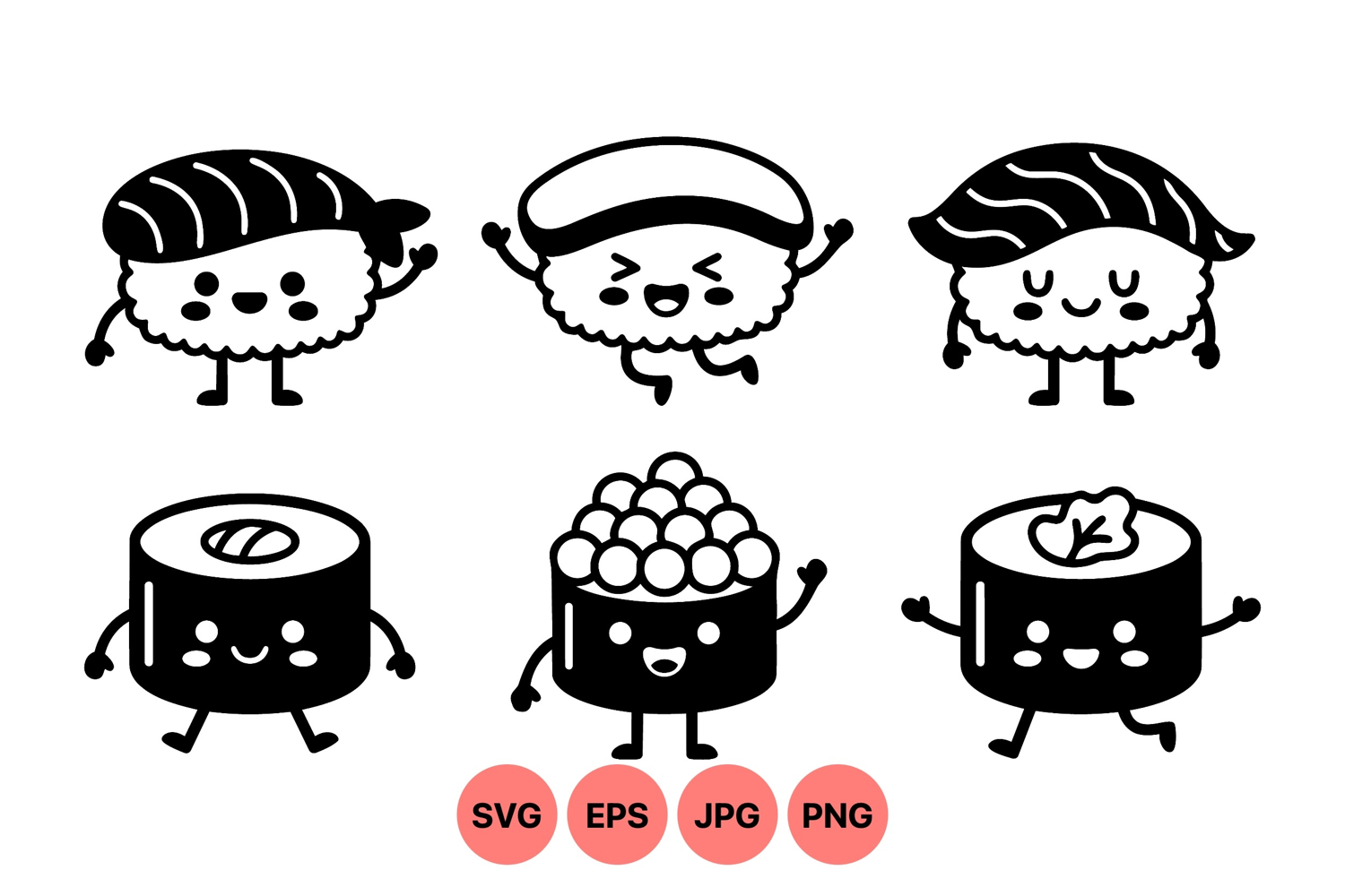 A of kawaii style sushi nigiri and maki rolls featuring smiling faces and animated arms in simple black and white vector art ideal for playful food design projects