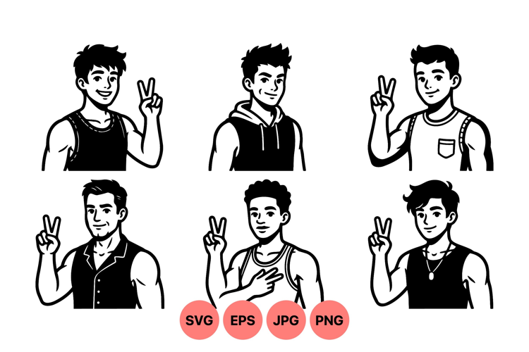 Six male cartoon characters display peace sign with various hairstyles and casual outfits including sleeveless shirts and hoodies in black and white flat vector style peaceful mood