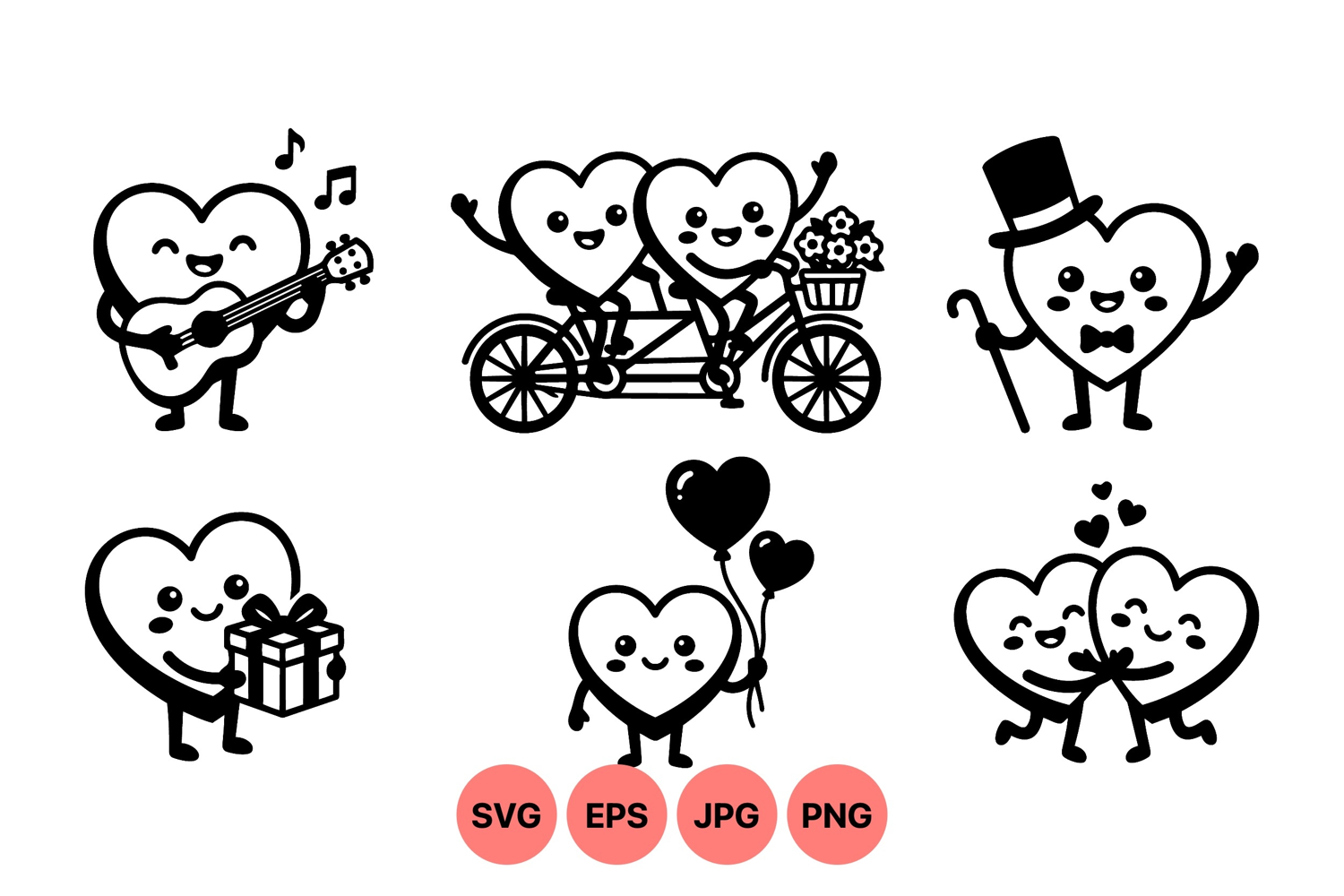 Playful black and white heart characters depict love with musical guitar playing, tandem bike riding, balloon holding, gift giving, and affectionate hugging in a charming vector style.