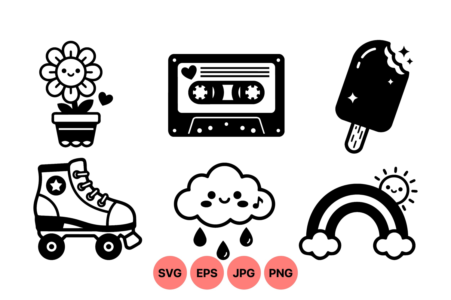 Cute Kids Design Black And White Svg Happy Cloud Illustration Flower Pot Artwork Playful Vector Art Retro Doodle Clipart Ice Cream Clipart Design Roller Skate Graphic Smiling Rainbow Drawing Cassette Tape Art