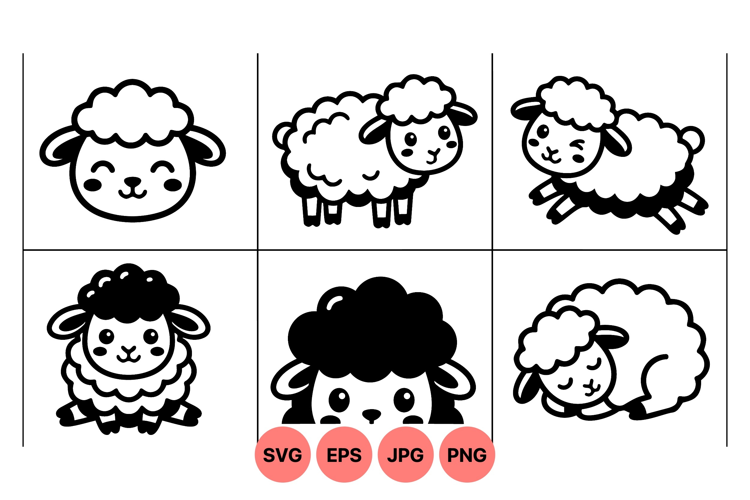 A charming of six black and white sheep illustrations showcasing different playful expressions and poses suitable for children or farm themed design in vector style.