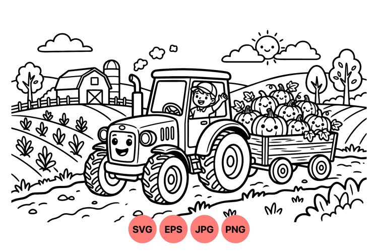 Pumpkin Wagon Clipart Pumpkin Harvest Art Cute Farm Tractor Child Friendly Illustration Fall Harvest Graphic Black White Tractor Autumn Farm Drawing Tractor And Pumpkins Kid Tractor Graphic Cartoon Farm Vehicle