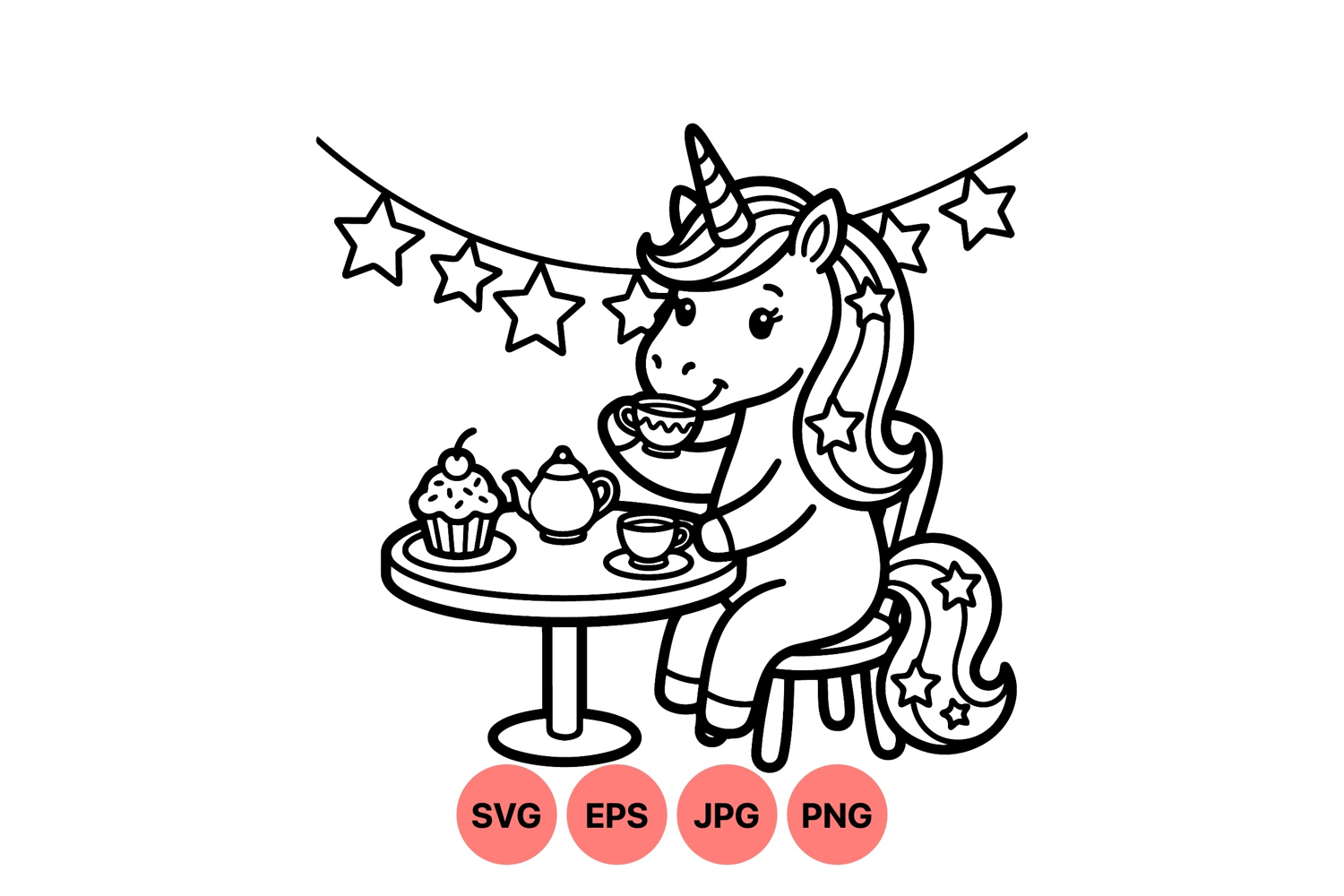 A charming unicorn enjoys tea at a round table with cupcake and teapot surrounded by hanging stars in a simple black and white line art style creating a playful mood.