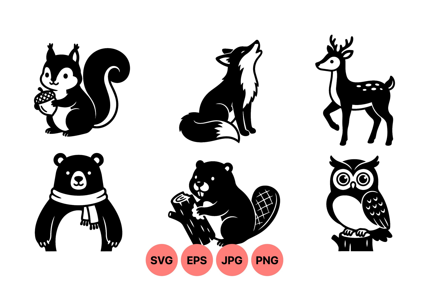 A charming vector of black and white woodland animals showing playful squirrel with acorn howling fox gentle deer bear in scarf busy beaver and attentive owl silhouettes peaceful composition