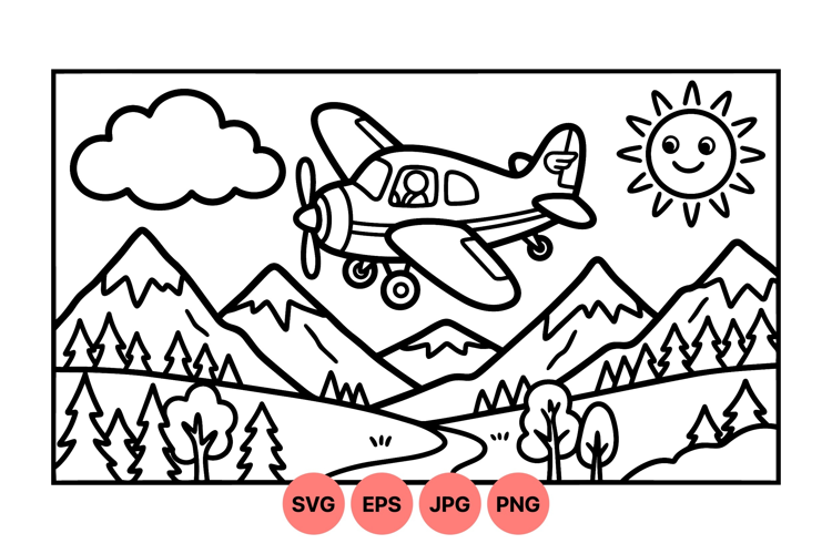 Hand Drawn Lineart Children Coloring Page Travel Theme Graphic Outdoor Adventure Illustration Mountain Landscape Art Airplane Clipart Design Cute Cartoon Plane Nature Scene Drawing Sun And Cloud Art Forest River Illustration