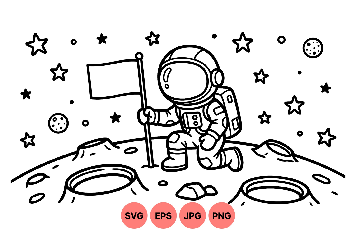 A black and white line art astronaut kneels while planting a flag on the moon surface surrounded by stars and planets in space scenery simple vector illustration.