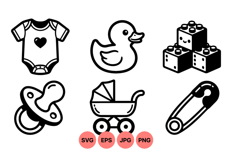 Simple black and white vector icon includes baby onesie with heart duck toy building blocks pacifier stroller and safety pin in clear line art style suitable for baby themed designs peaceful