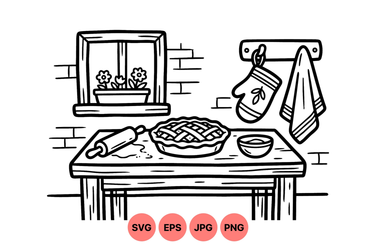 A charming black and white line art depicts a cozy kitchen with a wooden table holding a freshly baked pie and rolling pin by a window with flowers and hanging oven mitt and towel creating a peaceful atmosphere