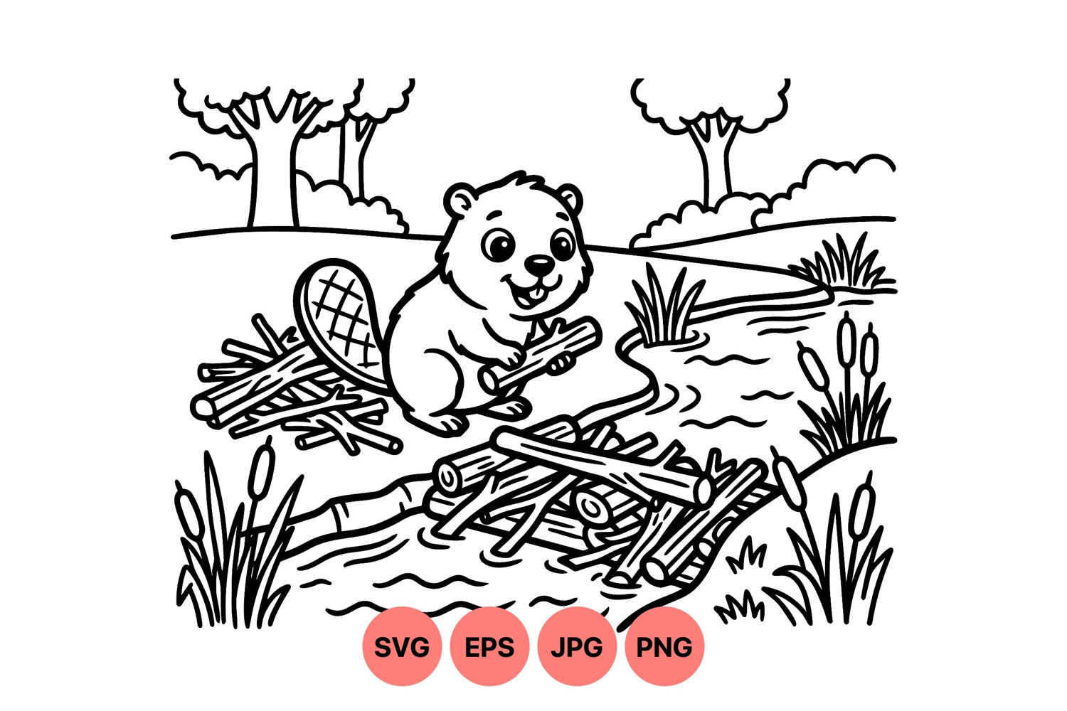 A playful beaver constructs a dam with logs and sticks on a flowing river surrounded by grass and trees in a clean black line art vector style peaceful scene
