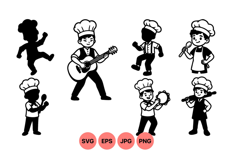 Black White Silhouette Chef Kids Vector Cooking Children Illustration Cute Kitchen Characters Music Kids Graphics Playful Chef Clipart Baking Child Design Apron Cooking Art Guitar Tambourine Kids Happy Cooking Children