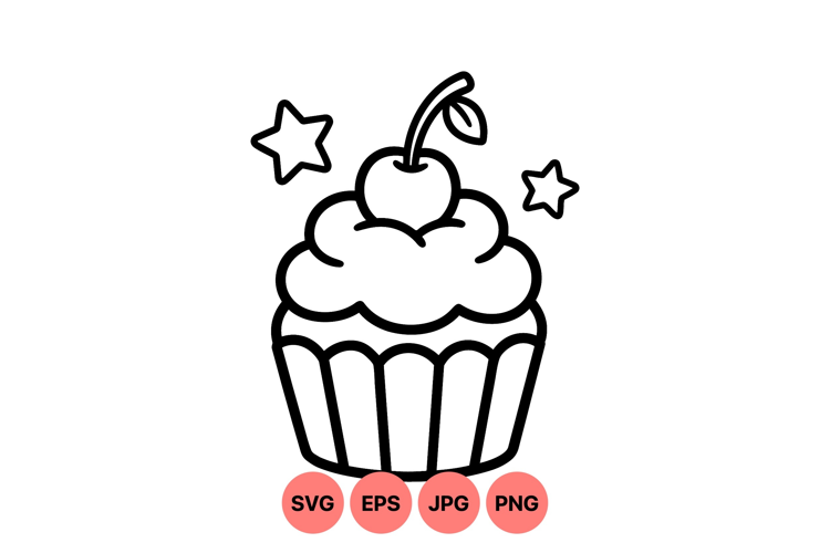 A simple and clean black line art vector of a cupcake topped with cherry and stars, perfect for icons, stickers, and minimal graphic projects with playful mood.