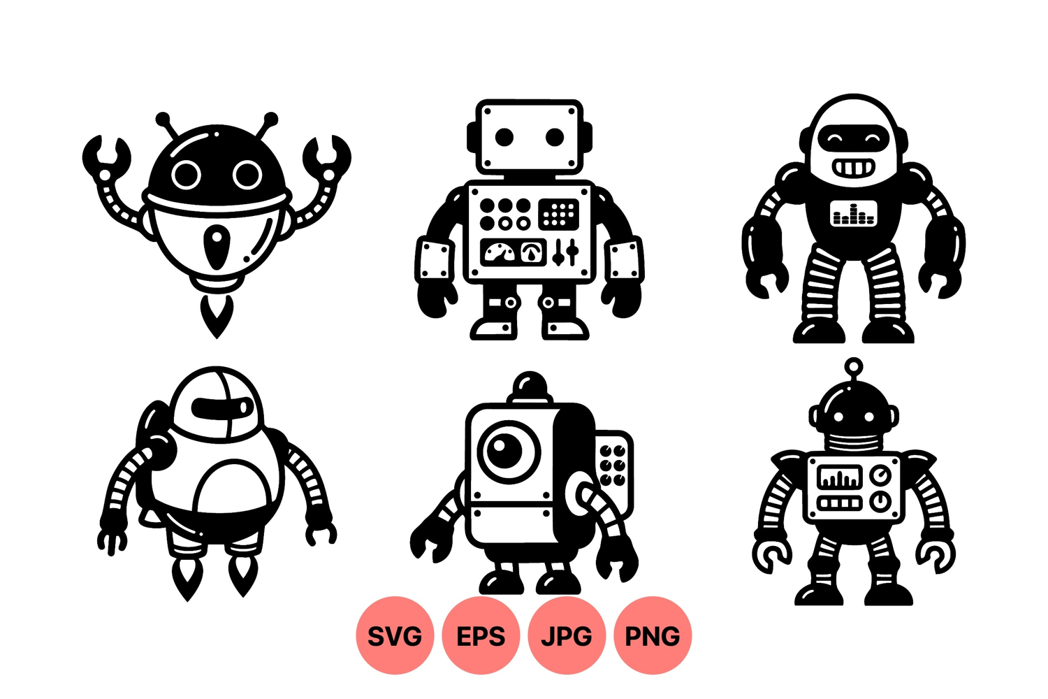A of six black and white robot icons with retro mechanical designs featuring different arm and leg styles isolated on white background creating a minimalist and playful mood.