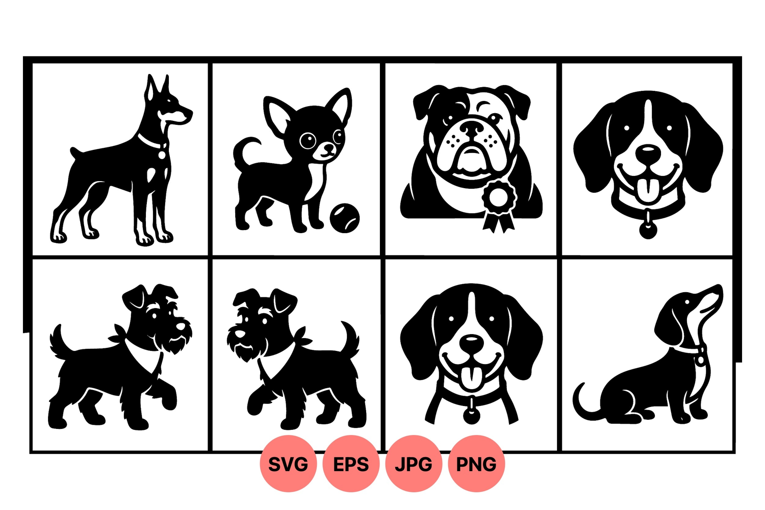 of black and white dog icons featuring various breeds including doberman chihuahua bulldog beagle schnauzer and dachshund in playful cartoon style illustrations for pets and design.