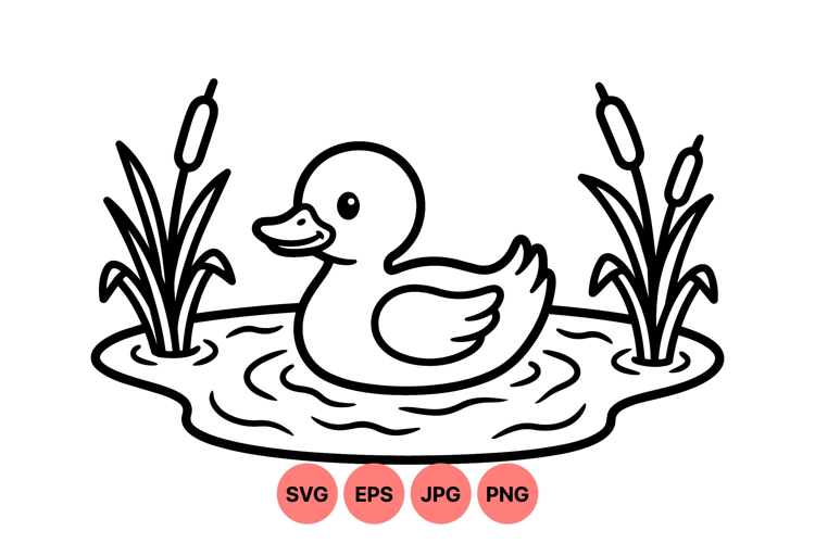 A charming black and white cartoon duck floats in a small pond surrounded by cattail plants. the simple line art style makes it suitable for children projects and coloring books peaceful and clean.