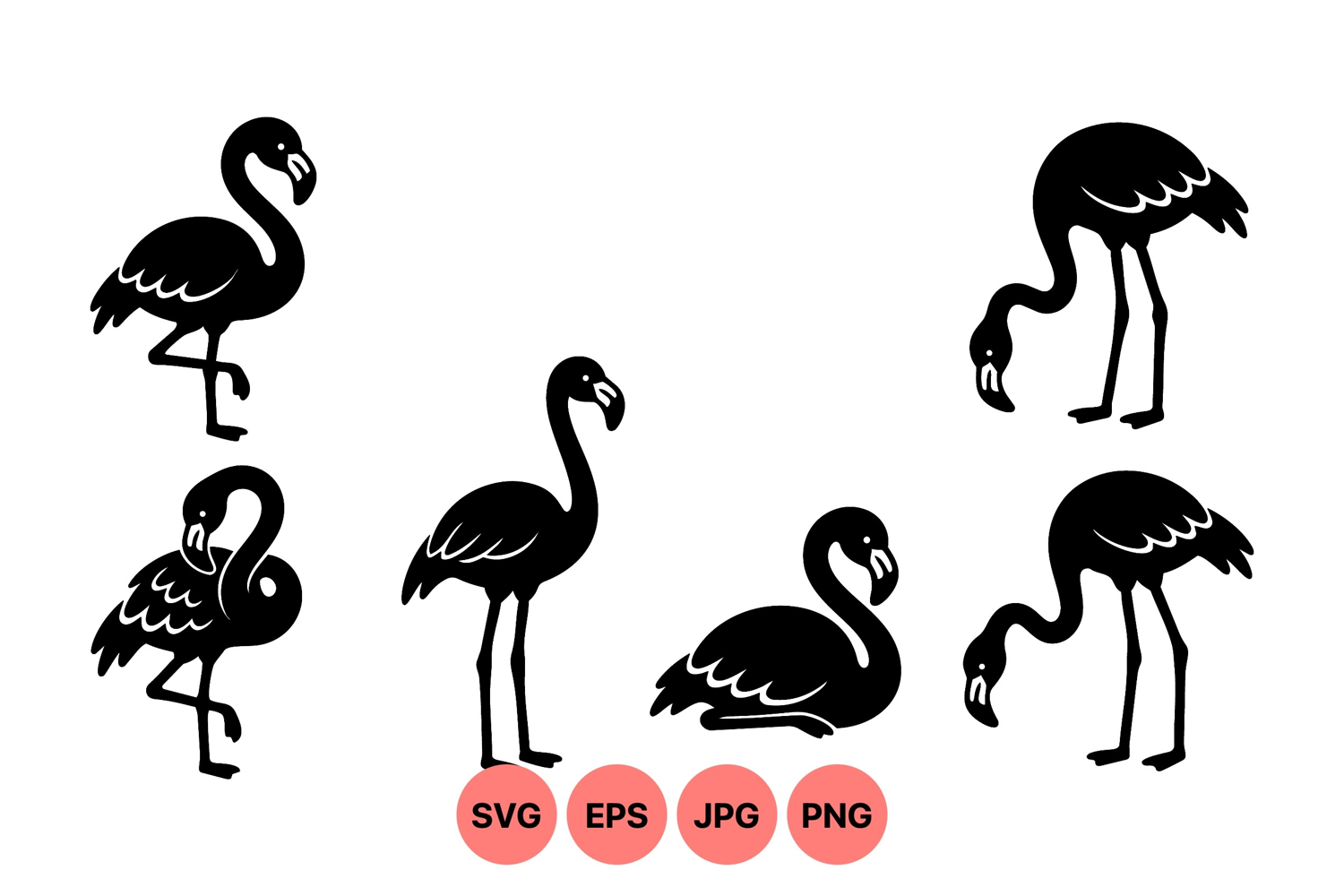 A of six black flamingo silhouettes showing various postures including standing resting and bending necks displayed in minimalist vector style peaceful and clean