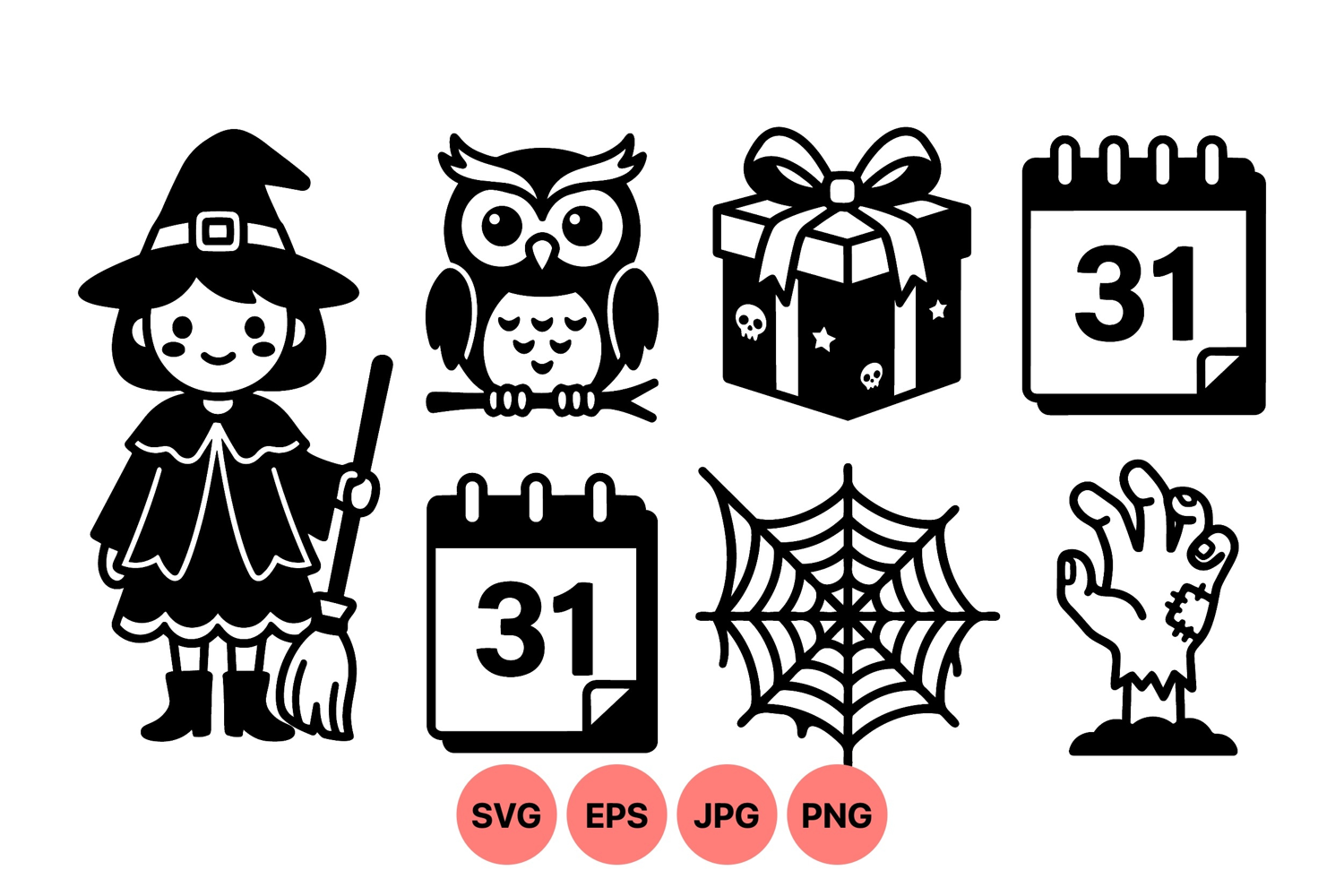 A of black silhouette halloween icons including a smiling witch with broom owl perched on branch spooky gift box calendar pages spider web and zombie hand rising from ground in vector style.