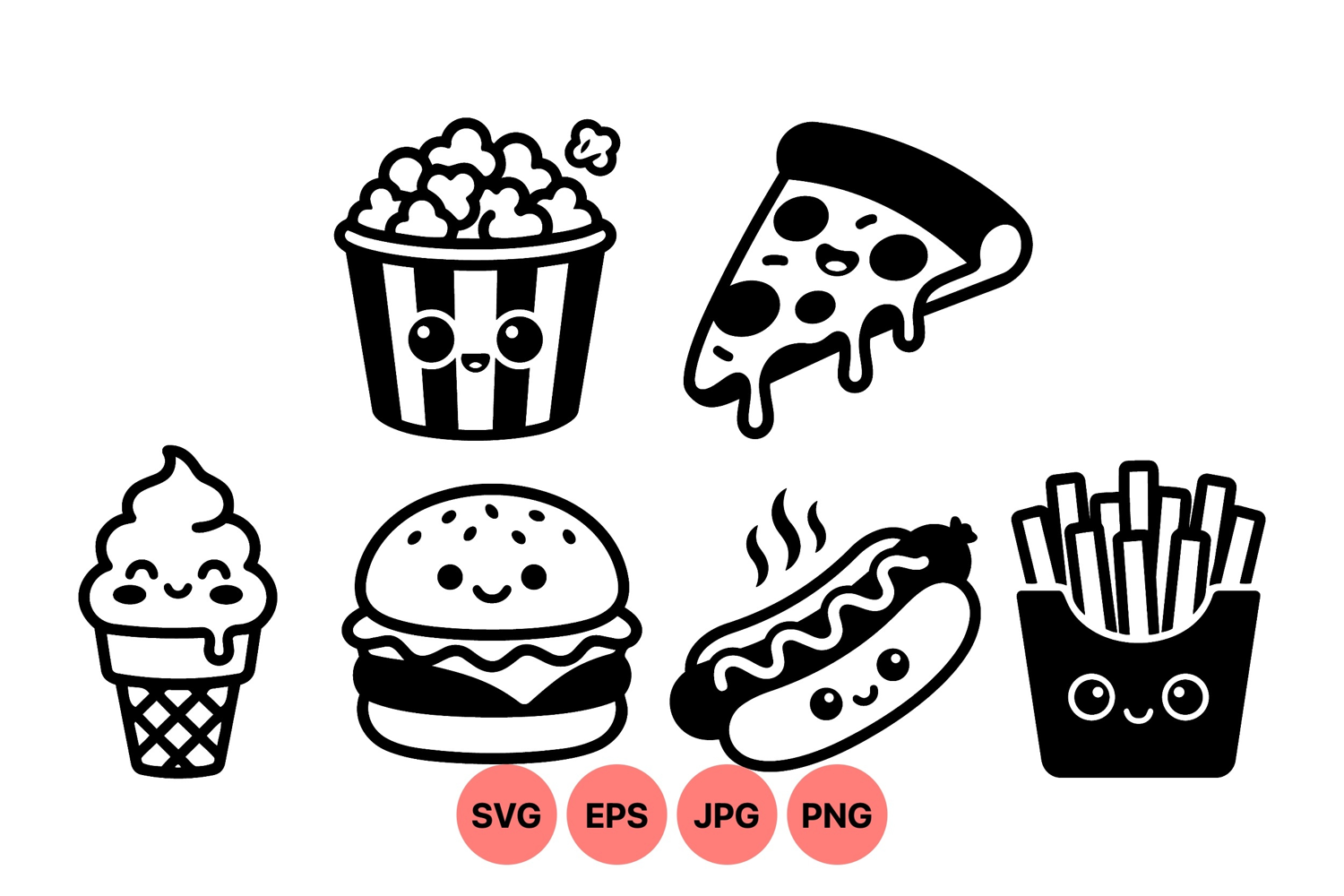 A kawaii style vector art featuring smiling cartoon popcorn, pizza slice, burger, hot dog, fries, and ice cream cone food icons with simple black line design and joyful expressions.