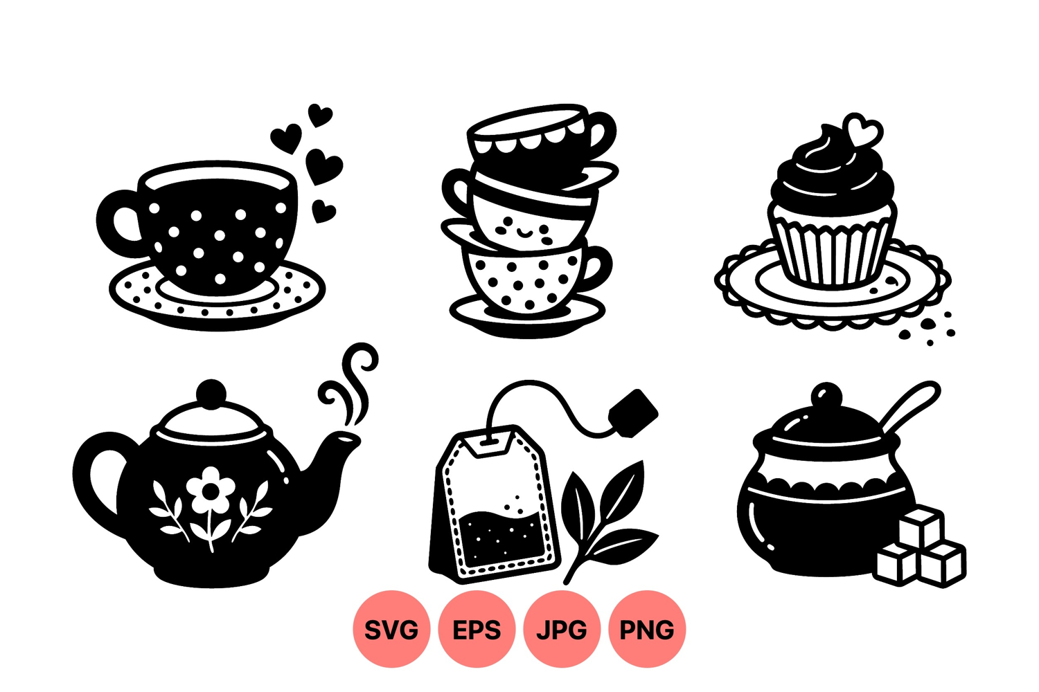 A charming black and white flat design features stacked polka dot teacups steaming teapot cupcake with heart and sugar bowl with cubes for tea lovers delightful and playful.