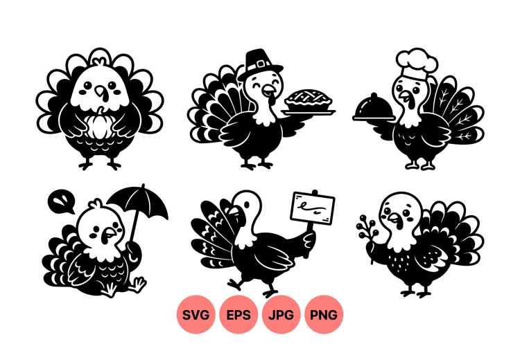 Adorable cartoon turkeys shown with various objects including pie plate umbrella chef hat and sign in flat black and white vector style playful and charming design