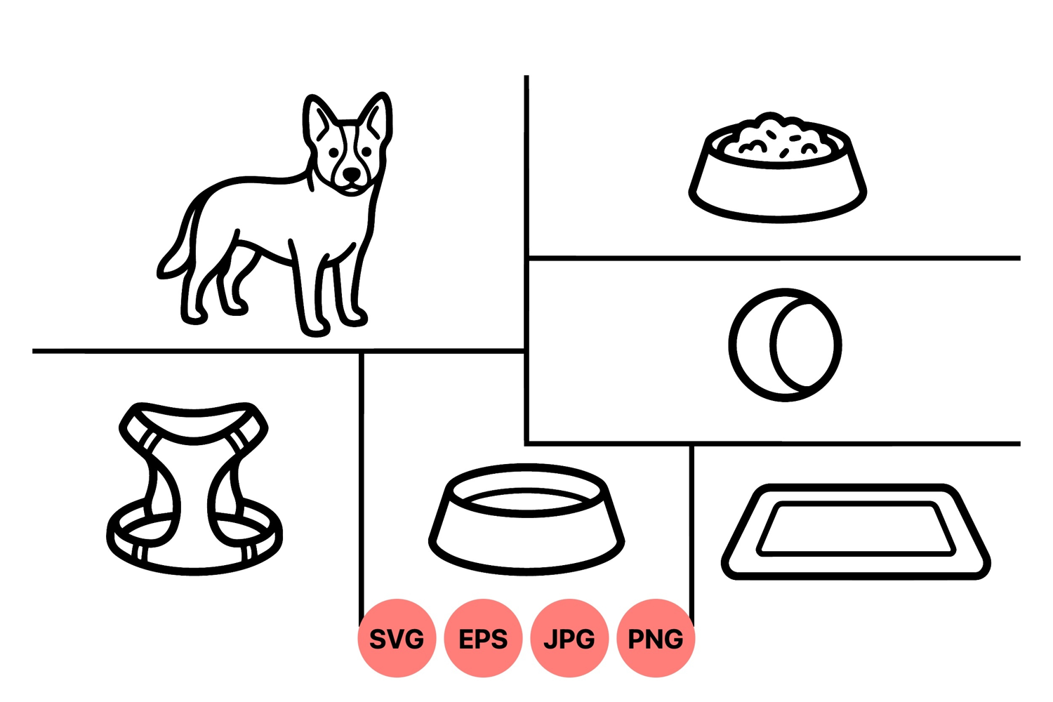 Simple black line art shows a standing dog with pet items including harness, food bowl, ball, water bowl, and feeding mat in clean minimalist style, suitable for pet care visuals.