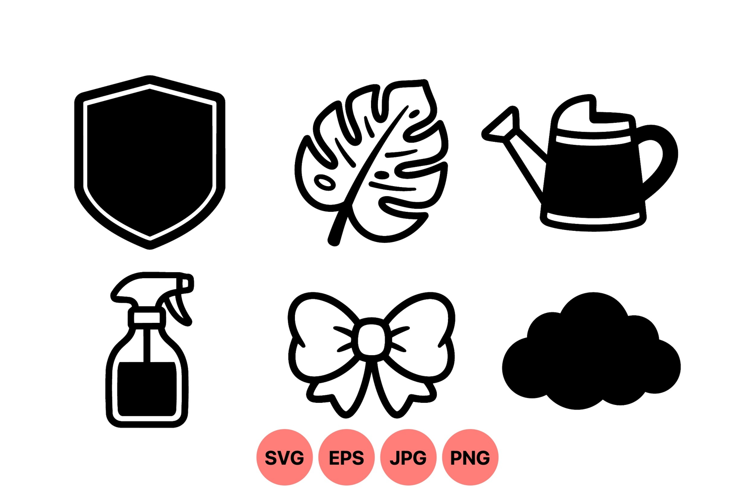 Six black silhouette icons including a shield, tropical leaf, watering can, spray bottle, decorative bow, and fluffy cloud shown in minimal vector style for multiple uses and designs