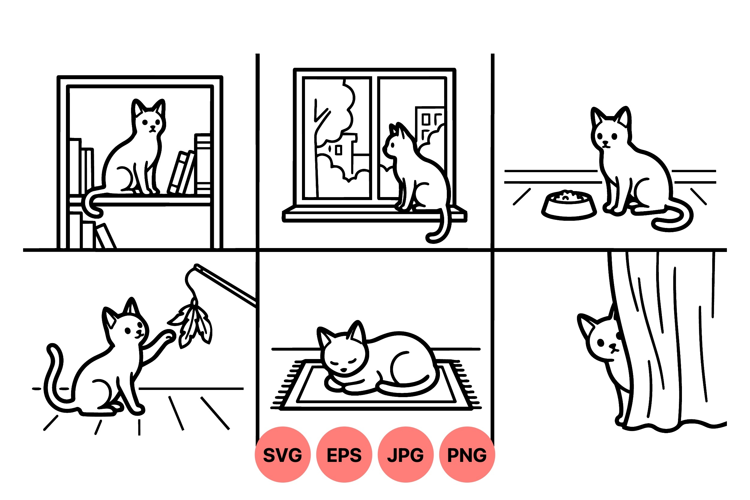 A simple black and white vector line art illustrates a cat in various poses including sitting on a shelf, looking out a window, playing, eating, sleeping, and hiding behind a curtain indoors, peaceful and clean.