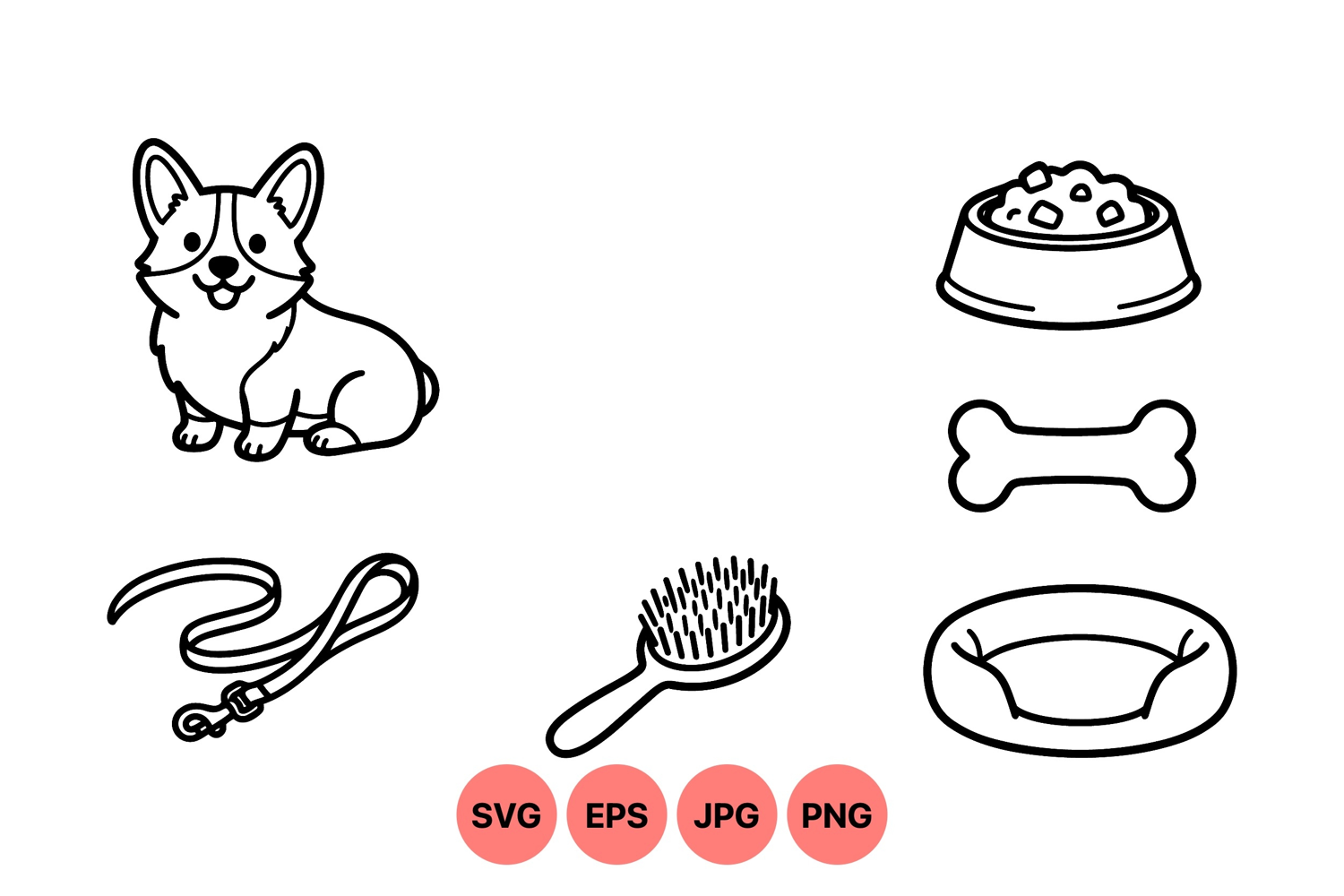 Pet Food Bowl Corgi Dog Illustration Cute Puppy Art Dog Bone Graphic Pet Accessory Clipart Dog Leash Drawing Dog Grooming Brush Digital Dog Lineart Animal Companion Graphic Dog Bed Illustration