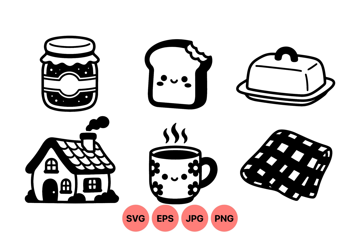 Playful kawaii style breakfast themed vector including smiling toast with bite jar of jam steaming floral cup cozy house and checkered blanket in black and white line art