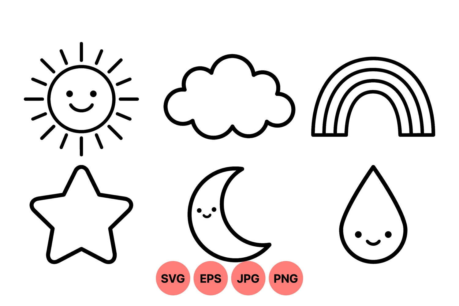 Minimalist vector line art displaying smiling sun, cloud, rainbow, star, crescent moon, and water drop icons with clean outlines perfect for children themed designs and education materials.