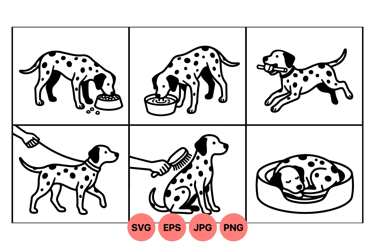 Simple black and white vector illustrations depict a spotted dog performing various actions such as eating from bowl drinking water running outside walking on leash being brushed and sleeping peacefully in bed