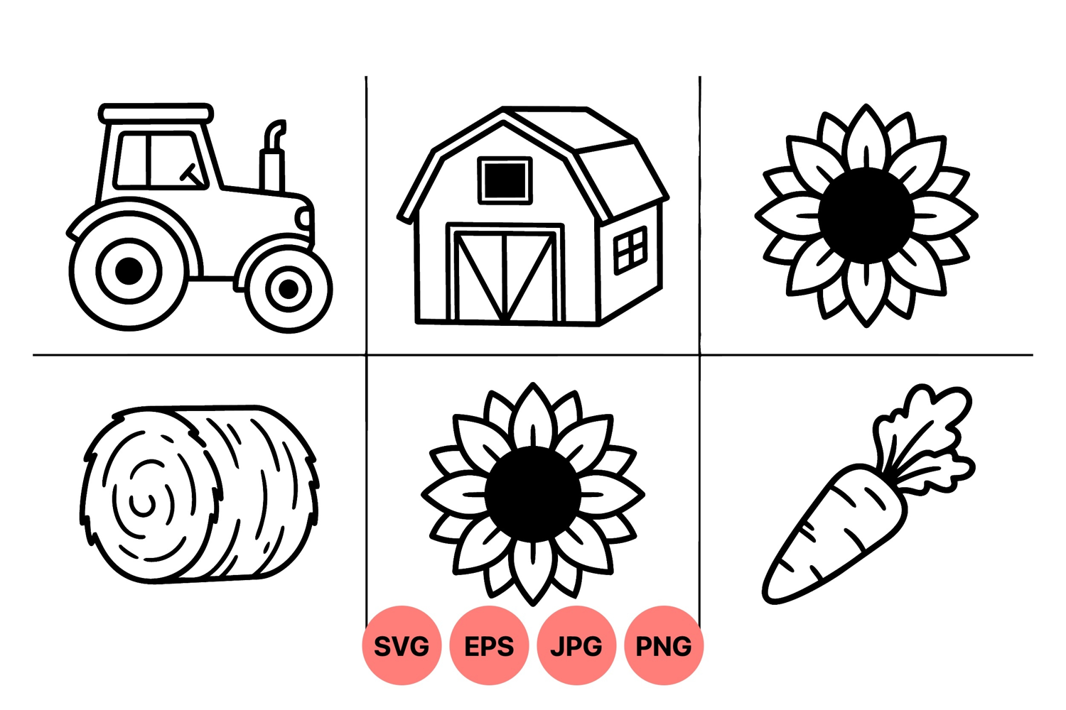 Farm Life Illustration Black And White Farm Tractor Clipart Design Barn Building Graphic Sunflower Drawing Art Carrot Vegetable Image Hay Bale Artwork Rural Farm Graphics Outline Farm Elements Agriculture Themed Clipart