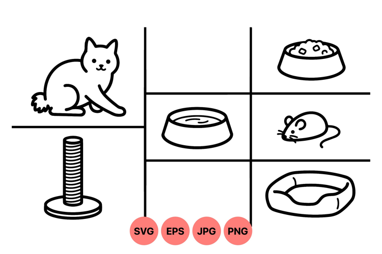 Clean minimalist line art presents a cat with scratching post food bowls mouse and pet bed icons arranged in a grid layout showcasing pet care essentials