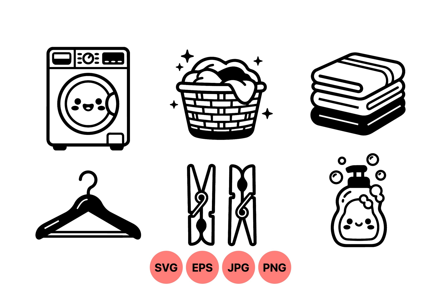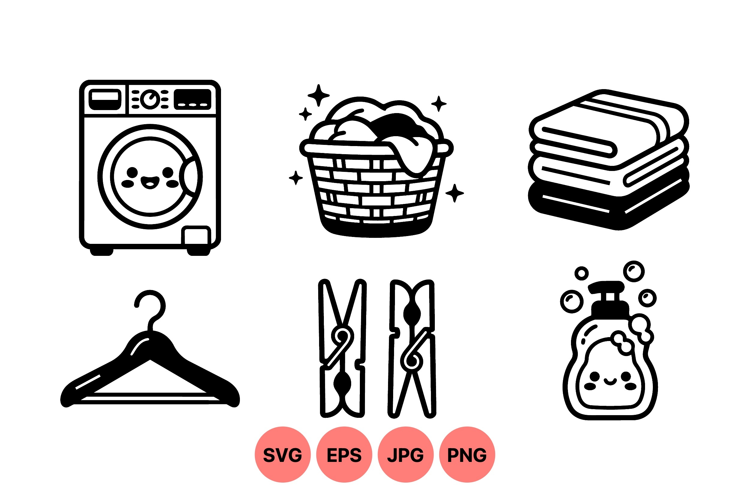 A kawaii style of laundry icons featuring a smiling washing machine, full basket, neatly stacked towels, clothes hanger, clothespins, and bubbly soap dispenser in black and white.