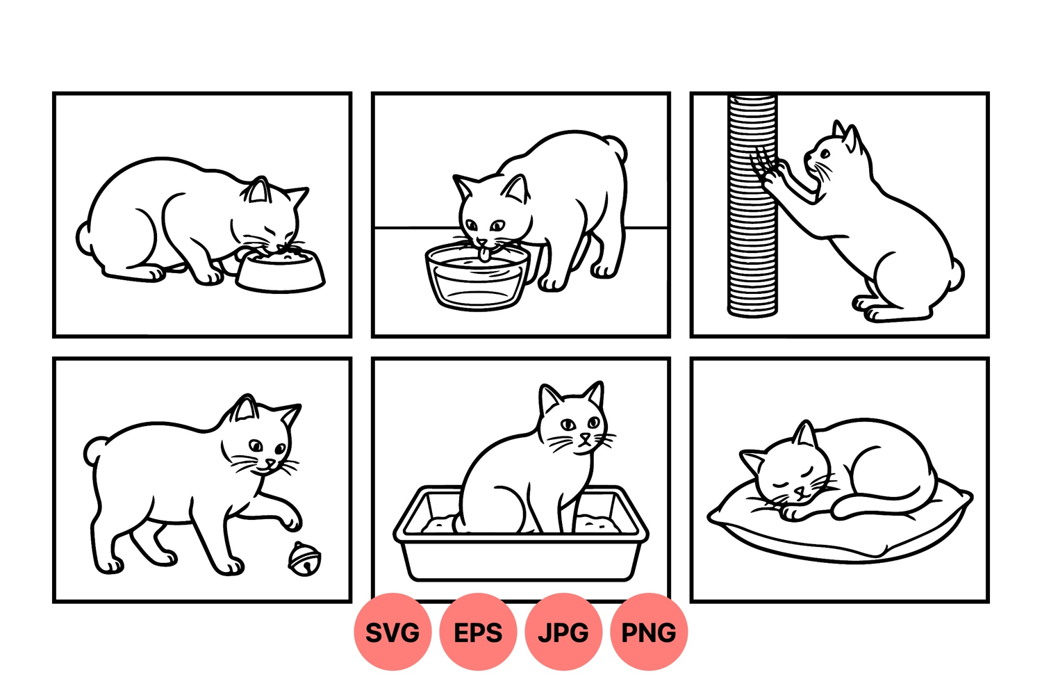 of black and white line art vector illustrations showing a cat eating food drinking water scratching a post playing with a bell sitting in a litter box and sleeping on a pillow peaceful and simple design
