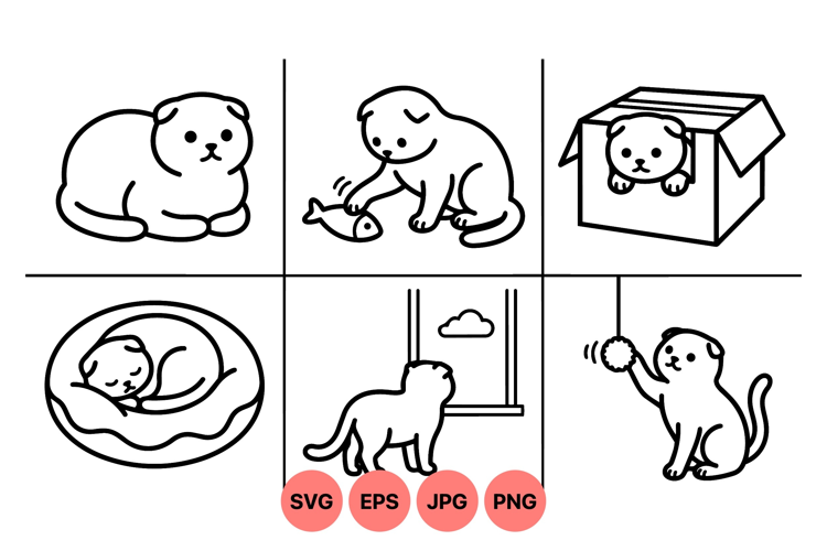 Simple vector line art features cat in various poses including sleeping curled up playful kitten with fish curious cat looking out window and cat inside box peaceful and playful mood